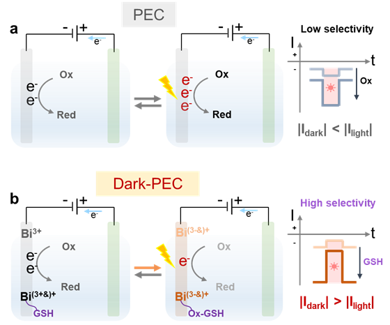 鉴于此,武汉工程大学胡六永教授以及华中师范大学朱成周教授课题组合作在PEC系统的选择性调控与机制创新研究中取得了新进展。该团队设计并构建了一种基于溴氧化铋(BiOBr)光阴极的暗增强光电化学(dark-PEC)系统,突破了传统PEC系统光增强的固有模式。利用铋的可逆还原特性,实现了光阴极上氧还原位点的钝化与再生,成功获得了|Idark| > |Ilight|的非常规反向光电流信号。借助谷胱甘肽与BiOBr之间的选择性结合及电荷转移作用,显著提升了铋还原的可逆性,使反向光电流增强10倍,实现了光阴极对还原剂分子的选择性识别。该研究揭示了一种全新的光电化学反应机制,有效解决了传统PEC系统选择性不足的难题,显著拓展了PEC系统的应用场景,为该领域的器件设计与氧化还原过程研究提供了重要参考。