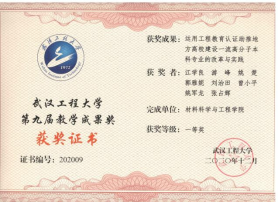 江学良,2023年学校研究生“四有好导师”之一,现任bw必威西汉姆联官方网站院长、教授、博士生导师。曾获湖北省科技进步二等奖、三等奖各1项,中国石油化工联合会科技进步二等奖1项,教育部专利奖二等奖1项,湖北省高等学校教学成果奖三等奖2项,中国石油与化工教育教学成果奖二等奖1项,中国大学生高分子材料创新创业大赛优秀指导老师等荣誉。发表论文240余篇,其中SCI收录论文100余篇担任Frontiers in Materials(SCI)期刊副主编,《胶体与聚合物》、《武汉工程大学学报》编委。