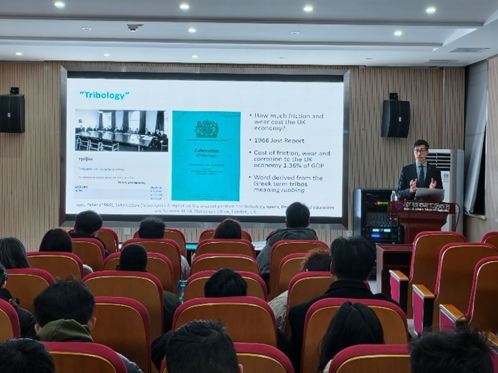 报告中,Tomasz教授以摩擦学与表面工程的发展脉络为切入点,从早期的经验观察出发,梳理至《乔斯特报告》后摩擦学学科正式确立的关键节点,清晰阐释了该学科在现代工程系统中的核心地位。他特别指出,表面相互作用带来的经济与环境影响长期被低估,仅摩擦、磨损和腐蚀对英国经济的影响就占到 GDP 的 1.36%。围绕表面工程的技术应用与实践价值,Tomasz教授详细讲解了通过针对性表面性能改性解决工程领域关键问题的思路与方法,并结合石油天然气、汽车、生物医学、航空航天及消费品等多个行业的实际工业案例,生动展示了表面工程在推动高端制造发展中的关键作用。报告内容兼具理论深度与实践广度,既有前沿的学科理论讲解,又有鲜活的工业应用实例,让师生们沉浸式感受了国际前沿的研究思路与应用方向。
