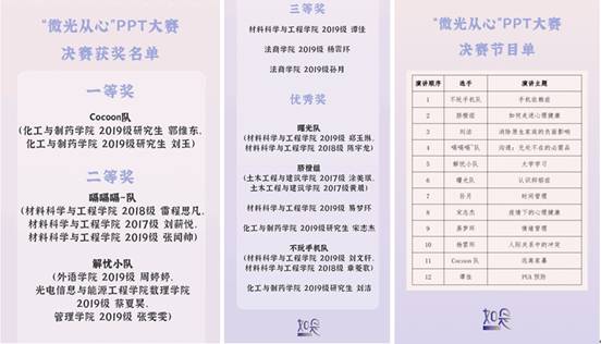 进入决赛的十二组参赛选手依次演示PPT,并辅以视频、故事、配乐等多种呈现形式,分享对所准备心理健康主题的认识与思考。“不玩手机队”分享了手机依赖症的产生和克服方法;“脐橙组”从心理健康的概念、标准以及大学生常见问题与解决方法几个方面讲述了如何提高心理健康水平;化药学院2019级研究生刘洁谈到了原生家庭的负面影响,提出“我们要正视和积极面对原生家庭带来的负面影响,勇敢地摆脱原生家庭在某些方面对自我的束缚”;“嗝嗝嗝队”以社会热点事件和疫情期间的家庭矛盾阐述了沟通的重要性,建议大家不要一味地回避矛盾,学会通过沟通化解矛盾;“解忧小队”分析了大学学习中存在的问题和原因,并提出相应的解决方法;“曙光队”介绍了抑郁症的症状,倡导大家正视抑郁症,共情陪伴患有抑郁症的亲友;法商学院2019级孙月分享了时间管理和拖延症的知识,推荐了“仪式感打造”“手账记录”“子弹笔记”等具体的时间管理方法;化药学院2019级研究生宋志杰介绍了在疫情背景下各类人群的心理调适方法,倡议大家调整好心态面对疫情;材料学院2019级易梦环介绍了情绪管理的概念与方法;商学院2019级杨雲环讲述要懂得表达自己的情绪,正视人际关系的冲突。Cocoon队成员以亲身经历,提醒大家识别和远离家暴,并分享了面对家暴的方法,鼓励大家在遇到暴力时勇敢地保护自己。材料学院2019级谭佳介绍了预防PUA的方法,倡议塑造独立人格和健康的恋爱观。