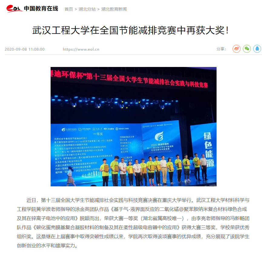 8月30日,第十三届全国大学生节能减排社会实践与科技竞赛决赛落下帷幕,bw必威西汉姆联官方网站2项作品入围决赛并分别斩获全国一等奖1项(湖北省属高校唯一)、三等奖1项,学校荣获优秀组织奖,受到广大社会媒体的广泛关注,并被《中国教育在线》报道。