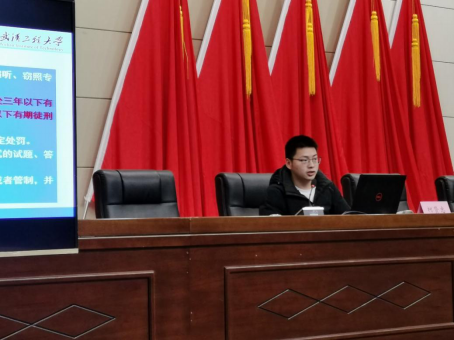 临近期末考试,考风考纪教育尤为重要,柯贤忠为同学详细解读了《武汉工程大学学生违纪处理办法》,并通过多起考试作弊处分的真实案例让初次面对大学考试的同学们深刻认识到作弊带来的严重后果,希望同学们克服侥幸心理,诚信应考,考出成绩,考出风采。