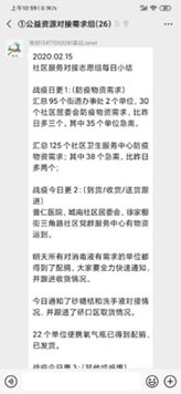 截至215日,所在志愿小组共计汇总95个街道办事处,30个社区居委会防疫物资需求,进行紧密对接,多家医院和社区已发来物资到位感谢信。