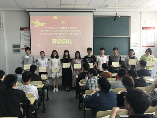 (通讯员 陈恩雨)4月24日下午2点,中共武汉工程大学委员会党校材料科学与工程学院分党校第59期入党积极分子培训班暨第1期发展对象培训班开班典礼在流芳校区4201教室举行,学院党委书记、分党校校长谢春晖,党委副书记、分党校副校长李佳以及全体辅导员老师出席了开班典礼。开班典礼由本期党校培训班班主任陈恩雨老师主持。