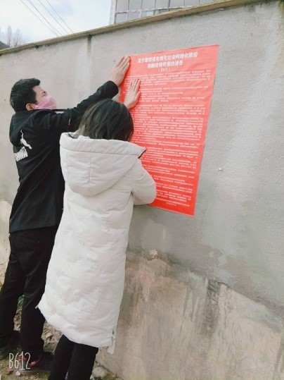 在街道上张贴疫情防控宣传单,让村民们了解疫情、重视疫情,避免大家麻痹大意、思想松懈,同时也避免村民受到新型冠状病毒肺炎的伤害,防止疫情扩散。同时,挨家挨户开展外出务工人员调查统计,以便为需要外出务工人员做好准备和防控,让他们能够安全地外出,并且到达目的地后能够正常上班,确保家庭经济来源。