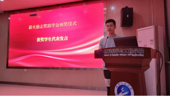 王涛代表学院对校友代表的到来表示热烈欢迎和衷心感谢,“薪火励志”奖助学金是1999级无机非金属材料专业校友在毕业20周年返校聚会时提议并捐赠设立的,代表着材料校友对母校的一份情谊,对学弟学妹的一份关爱。校友们无私的捐助和在返校聚会中展现出的对母校和昔日恩师的眷念和不舍令人感动。他希望受助同学能以校友们为榜样,努力立大志、明大德、成大才、担大任,常怀感恩之心。感恩学长们的无私关爱,感恩母校悉心教导、感恩国家培养护佑。他表示,这次颁奖仪式既是为激励广大学生勤学奋进,也是一次感恩教育。希望大家饮水思源,将校友对学弟学妹的关心关爱薪火传承,发扬光大。