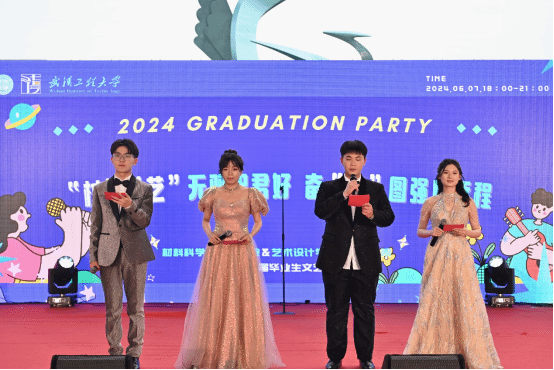 本次晚会由材料学院毕业生朱朵儿、刘伟栋,艺术学院毕业生胡明月以及法商学院在校生刘宇轩主持。