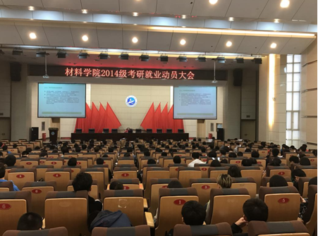 (通讯员 吴丕业)4月26日上午,材料学院在四教多功能报告厅举行2014级考研就业动员大会,材料学院院长刘治田,党委副书记李佳,2014级全体学生参加了大会。会议由2014级辅导员吴丕业主持。