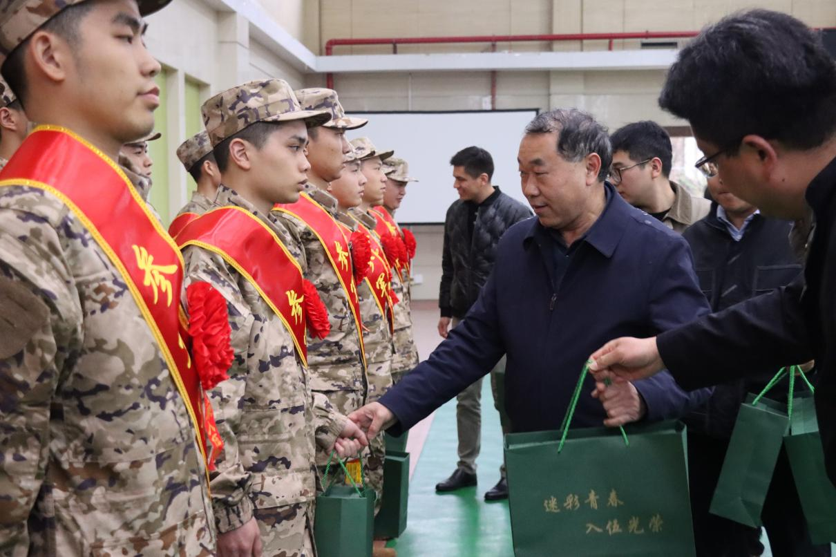 李志旭代表学校对通过役前训练,光荣入伍的同学表示热烈祝贺,并表示参军入伍是同学们将个人理想融入强国强军伟大事业的重要选择,是报效祖国、实现人生价值的重要途径,从校园到军营的跨越不仅是身份的转变,更是责任与担当的升华,勉励同学们在军营大熔炉中淬炼成钢,用知识助力强军事业,以行动践行报国初心。同时,为全体入伍学生颁发学校纪念礼包。