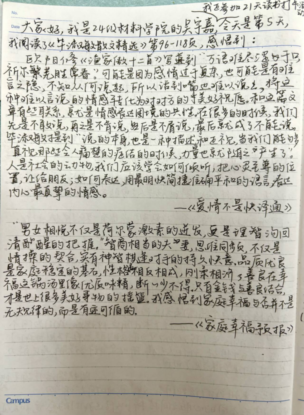 书籍,如同永不熄灭的明灯,照亮了我们前行的道路。21天的坚持,点燃了阅读的火种,让习惯的微光逐渐照亮浩瀚的精神原野。这场阅读之旅,不仅为参与的同学们带来了知识的收获,更为校园营造了良好的读书氛围。愿每一位捧卷之人,都能循着墨香指引,驶向更辽阔的星辰大海,在知识的海洋中绽放青春的光彩,为中国式现代化的推进贡献智慧与力量。
