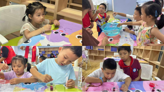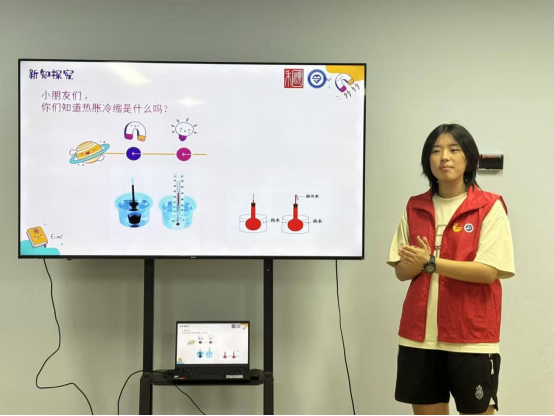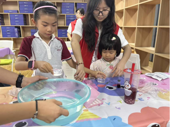 孩子们将透明玻璃管、带孔橡胶塞、装着红色墨水的小瓶等实验用品摆放在桌上,志愿者先示范组装步骤,确保每个环节都安全无误。待所有孩子完成组装,志愿者便带领大家做实验:先将温度计放入冷水中,管内的红色墨水慢慢下沉,孩子们屏住呼吸仔细观察;接着放进热水里,红色墨水瞬间像被点燃的小火苗,“噌”地一下往上窜,孩子们脸上满是对这神奇科学现象的好奇与兴奋。