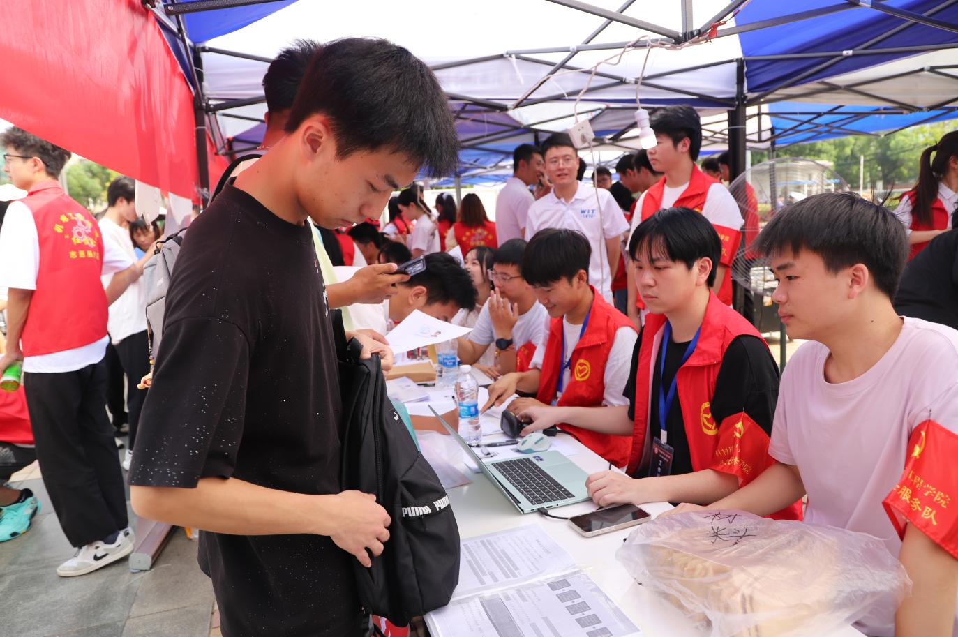 新生报到当日,校园里随处可见党员先锋岗志愿者们忙碌的身影。他们身着统一的志愿服装,佩戴醒目的“党员先锋”袖标,在学院迎新点、宿舍楼下、校园主干道等关键位置设立服务站点,形成了一条“点对点”的迎新服务链。在报到处,志愿者们耐心细致地为新生及家长讲解报到流程,协助完成身份核验、材料收取、校园卡激活等手续,引导新生快速完成报到;在行李搬运区,他们主动上前接过新生手中沉重的行李箱,无论是装满书籍的背包,还是塞满衣物的行李箱,志愿者们都二话不说扛在肩上、提在手中,穿梭在校园的各个角落,将行李安全送到新生宿舍;面对新生和家长关于专业学习、校园生活、社团活动等方面的疑问,志愿者们结合自身经历,用亲切的语言一一解答,为新生搭建起了解大学的“第一座桥梁”。