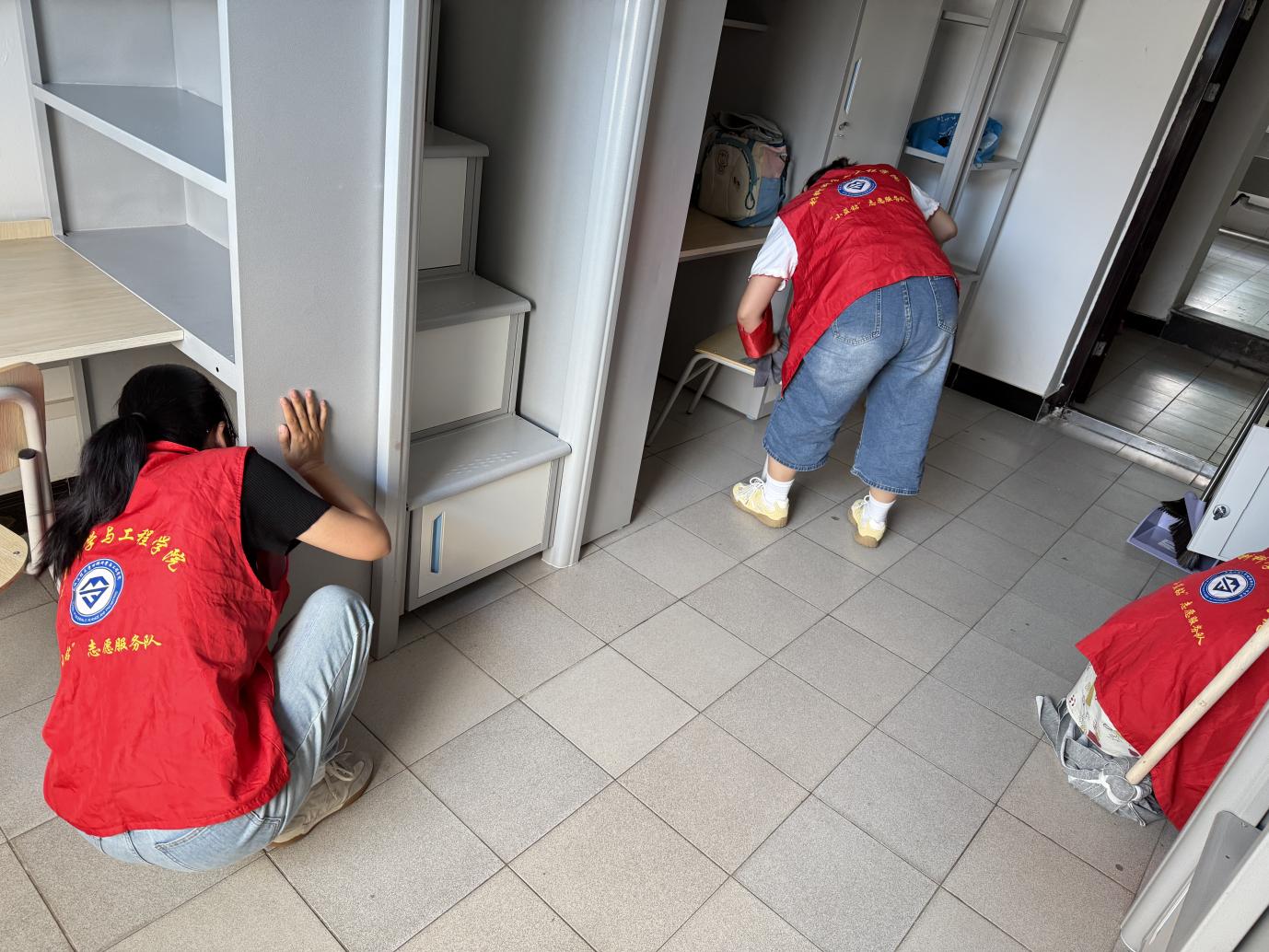 新生入学前,党员先锋岗的志愿者们便提前行动,化身“宿舍暖心管家”。他们主动带着清洁工具深入每一间新生宿舍,对地面、书桌、衣柜、阳台等区域进行全方位清扫。从擦拭积尘的窗台,到整理归置床铺被褥,再到检查水电设施是否完好,志愿者们不放过任何一个细节,用抹布擦拭的每一个角落、用扫帚清扫的每一寸地面,都承载着对新生的殷切期待。