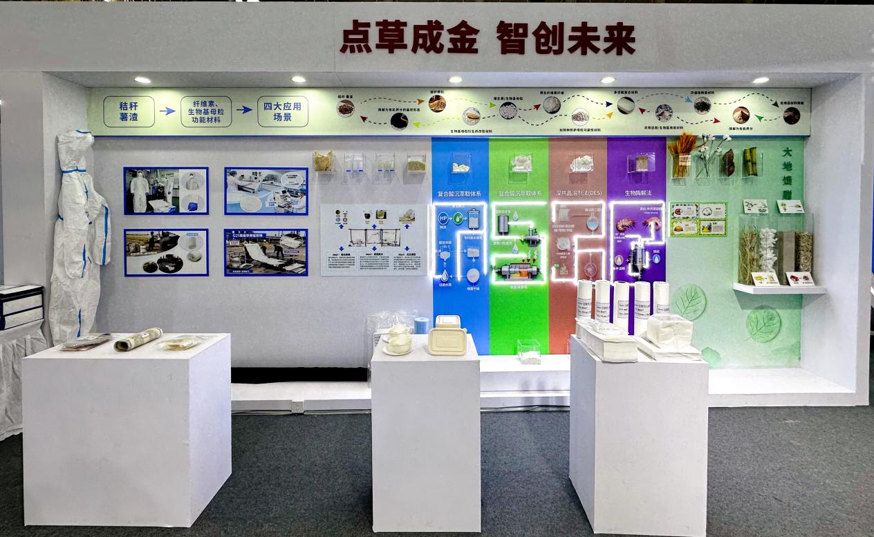 展会现场,“不负苕华”项目展厅凭借清晰的逻辑布局与丰富的实物展示脱颖而出。展厅以“农业原料—工业处理—创新技术—实际应用—循环转化”为主线,通过原料样本、中间产物、成品实物及工艺流程图,直观呈现了从红薯渣、秸秆等农业湿渣到生物可降解薄膜、餐具、包装材料的完整转化链条,让观众近距离感受非粮源性可降解材料在替代传统塑料、助力环保方面的核心优势。
