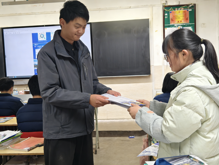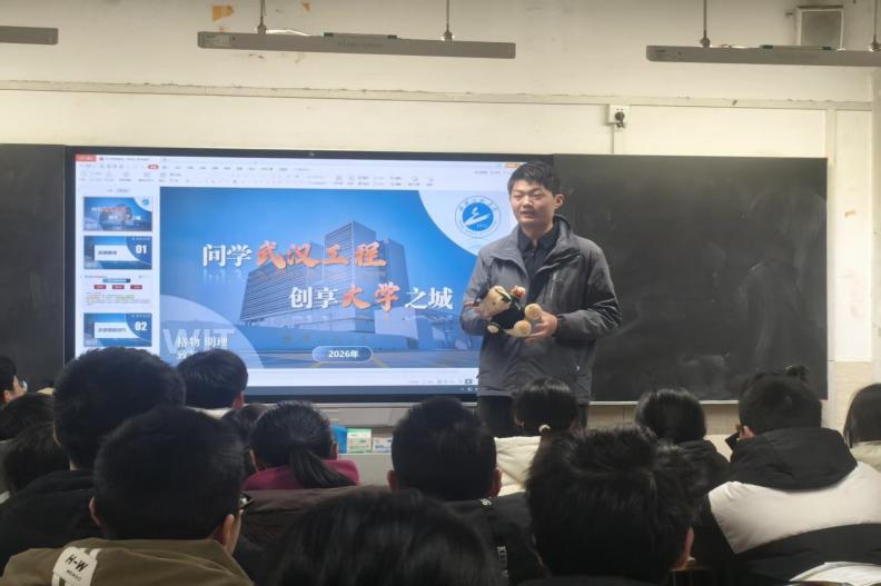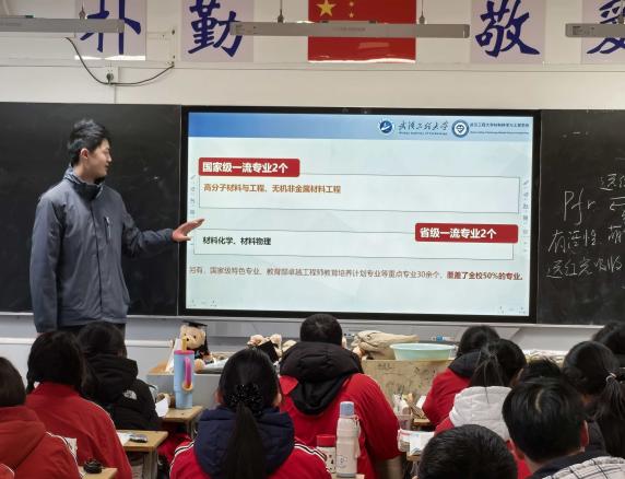 1月20日上午,王汤培走进安庆二中高三(8)班教室,用PPT进行专场宣讲。他先介绍武汉工程大学办学特色与核心学科实力,接着详细介绍材料学院师资、实验室建设成果和科创竞赛成绩,还延伸到校企合作资源、就业前景等受关注话题。每项内容配具体案例与详实数据,清晰呈现武工大的学科优势,让同学们对理想院校认识更清晰,为高考备考明确方向、注入动力。