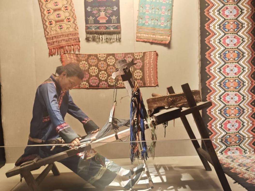 实践团首站聚焦土家织锦“西兰卡普”。这项技艺于2006年入选首批国家级非物质文化遗产,以“通经暗纬、断纬挖花”为核心工艺,被誉为“土家文化的活化石”。在博物馆织造展区,团队成员近距离观摩传统织机的操作流程:匠人指尖穿梭,彩线交错,一幅幅纹样古朴、色彩鲜明的织锦在机杼声中渐次成形,尽显土家族世代相传的匠心与智慧。