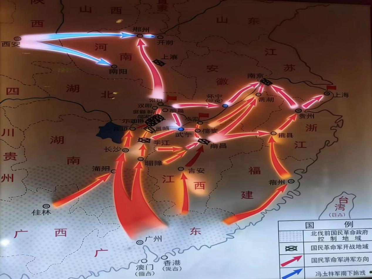 移步“北伐进军路线”展墙,一幅原比例老地图瞬间吸引了队员黄艳的目光:从广州北上的箭头直指咸宁,汀泗桥被红笔重重圈出,标注着“咽喉”二字。地图旁,两枚锈迹斑斑的步枪弹壳并排陈列,标签上写着“桥南缴获,弹痕未磨”。地理课上曾学到的“兵家必争”,在这一刻有了可感知的温度——小小的汀泗桥,锁住的不仅是北伐的前程,更是民族的希望。