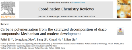 (通讯员 彭祥 李非非)近日,bw必威西汉姆联官方网站新能源材料与器件团队李非非博士指导本专业本科生对近20年来卡宾聚合的研究进展进行了系统综述,不仅涵盖了卡宾聚合的高效引发体系、可控/“活性”卡宾聚合、超高分子量/高度立构规整性卡宾聚合物的制备以及C1/C2共聚研究,同时还详细分析了卡宾聚合机理的研究进展。相关成果以题为“Carbene polymerization from the catalyzed decomposition of diazo compounds: Mechanism and modern development”发表在化学领域顶级期刊《Coordination Chemistry Reviews》(影响因子为24.83,中科院一区TOP)上。等离子体化学与新材料湖北省重点实验室为该论文第一单位,李非非博士为第一作者和唯一通讯作者,新能源材料与器件系2020/2021级本科生胡兴怡和李梆参与了此项工作。