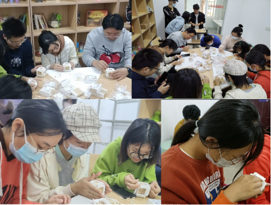 材料学院如是心理协会的王显磊介绍了“沉浸理论”的概念,引导参与者放松心情,全身心投入活动,并拆分步骤进行示范。同学们认真听讲解,一边动手操作,遇到困难的步骤互相帮助、互相鼓励,最终都完成了棉签房的制作。