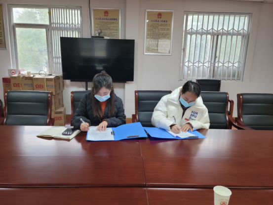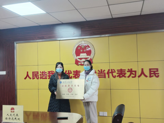 顺民社区党委副书记宋雪与材料学院团干张茜签订志愿服务协议,并共同为“志愿服务基地”揭牌。