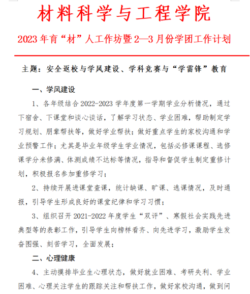 本网讯(通讯员 柯贤忠)新学期伊始,为进一步凝聚学院学生工作队伍力量,科学精心谋划新学期学生工作,有序推进各项工作常态化规范化。2月23日,材料学院召开2023年育“材”人工作坊暨新学期第一次班主任工作例会,学院党委副书记张琼、全体辅导员和班主任参加会议。