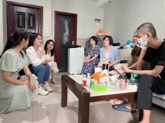 (通讯员张茜、安佰谦)7月23日上午,武汉工程大学党委副书记郑丹凤、学工部副部长徐迪迪、材料学院党委副书记张琼、2022级辅导员张茜、2023级辅导员安佰谦、环生学院博士研究生夏静一行赴江汉区新华天瑞国际1006谭学谦与妈妈临时租住的“家”中,看望骨髓移植恢复期的材料学子谭学谦及家人。