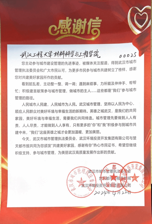 为答谢武汉工程大学“小蓝钻”志愿服务队连续八年在寒冷的冬天为环卫工人送上亲手编织围巾的善举,武汉市城市管理执法委员、楚天都市报极目新闻、武汉环境投资开发集团有限公司共同为学院颁发了“共建美好家园 感谢有你”奖牌和感谢信。期待双方共同缔造,让武汉这座英雄之城更加温暖、美丽。