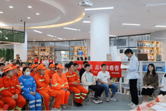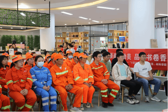 徐迪迪代表学校向东湖开发区城管局领导嘉宾、环卫工人朋友们的到来表示热烈的欢迎。她指出材料学院“温暖城市园丁”活动连续开展了八年,学校与城管局、大学生与环卫工人结下了深厚的情谊,共同向社会传递了尊重劳动者、关爱环卫工人、共建美丽城市的理念。本次活动是该项目的一个创新举措,她向大家发起倡议:要培养“敏而好学,不耻下问”的学习态度,对未知的事物保持好奇和渴望,永葆学习的热情和动力;要发扬“故书不厌百回读,熟读深思子自知”的钻研精神,选择经典书籍进行反复阅读,深入挖掘知识的内涵和外延;要磨砺“书山有路勤为径,学海无涯苦作舟”的坚毅品质,将阅读作为终身学习的事业,在书香的浸润下修身养性,深切感受生命的辽阔和人生的真谛。