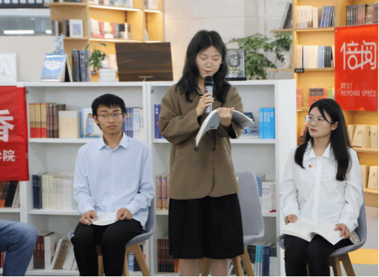 在读书分享环节,材料学院龚旭昕、黄如意、郭倩等3名同学依次为大家领读了《习近平故事》一书中《学而有思》、《30里借书》、《信仰的力量》等三个生动的小故事,引领大家感受中华文化智慧的结晶和强大的中国力量。